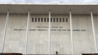 A sign altered in December 2025 marks “The Donald J. Trump and The John F. Kennedy Memorial Center for the Performing Arts” Image: Dclemens1971. Public Domain via Wikimedia Commons.