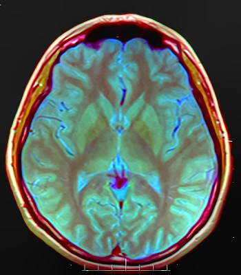 False color brain MRI, Red T1, Green PD tse, Blue T2 tse, Image: Nevit Dilmen Public Domain via Wikimedia Commons.